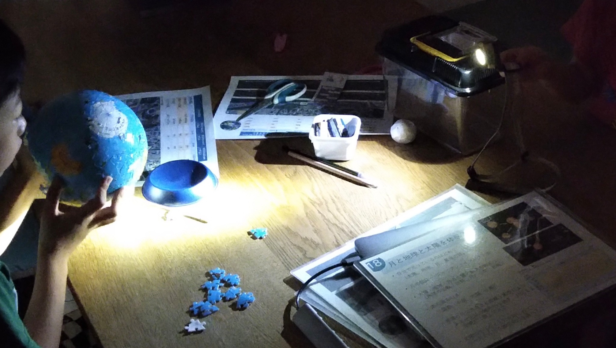 夏のあいだからやってみたいと思っていた「天体」の授業。しかし、天体観測?星座について?太陽系?どれもちょっとスケールが大きく、実感が湧くかどうか分からない(そして夜中限定の活動も)。そこで最も身近な天体である、月と太陽、そして地球の3体をまずは知ってもらおうと思いました。天体は「見る」ことが中心になりますが、「見る、知る」というより「体験」してもらえるような授業内容にしました。
