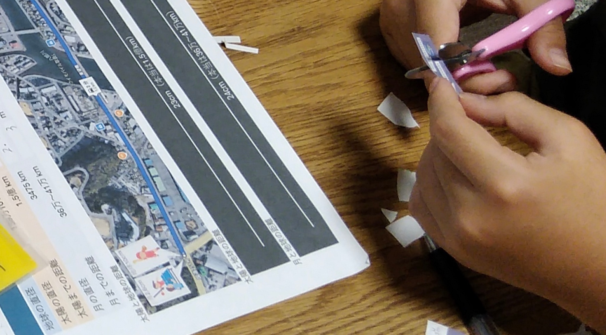 この数字はあくまで資料で、そこから「体験」が始まります。まず10cmの地球はソフトボールのサイズですから、塾のある地域の地図の「シャトレーゼ」あたりにソフトボールのシールを貼ります。では月はというとピンポン球サイズなので、そのシールをソフトボールから地図上で3m離れた場所に貼ります。
