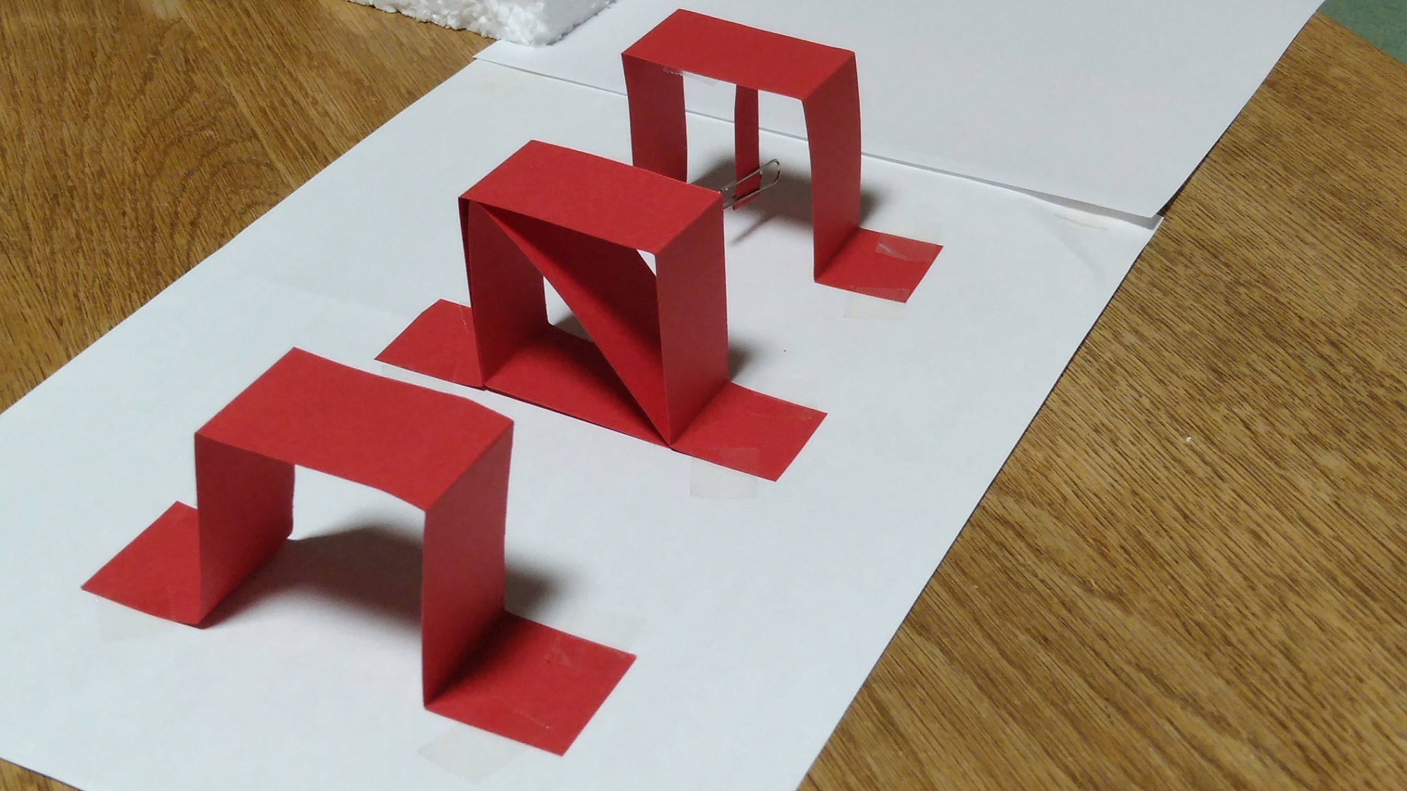 難しいかと思っていた工作ですが、こちらがカッターナイフで紙を切って渡し、生徒は線に沿って折る、こちらがテープを切る、生徒が台紙に貼る、という流れ作業がスムーズに進んでいきます。折り方が乱雑だったり、テープの貼り方が頑丈すぎたり😄。ゆがんで貼られた建物は「揺れ方が変わっちゃうからね」と理由を伝えてもう一度貼り直してもらったりしながら、きれいに3つの建物が並びました(1つの人や、4つ以上の人もいました)。