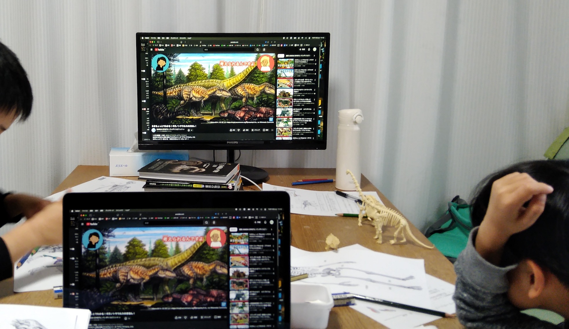 さらにネットの動画を見て、形や生態について分かってきていること、また研究が進むにつれて書き換えられていった事柄なども学びました(スピノサウルスの研究の歴史はおもしろかった!)。