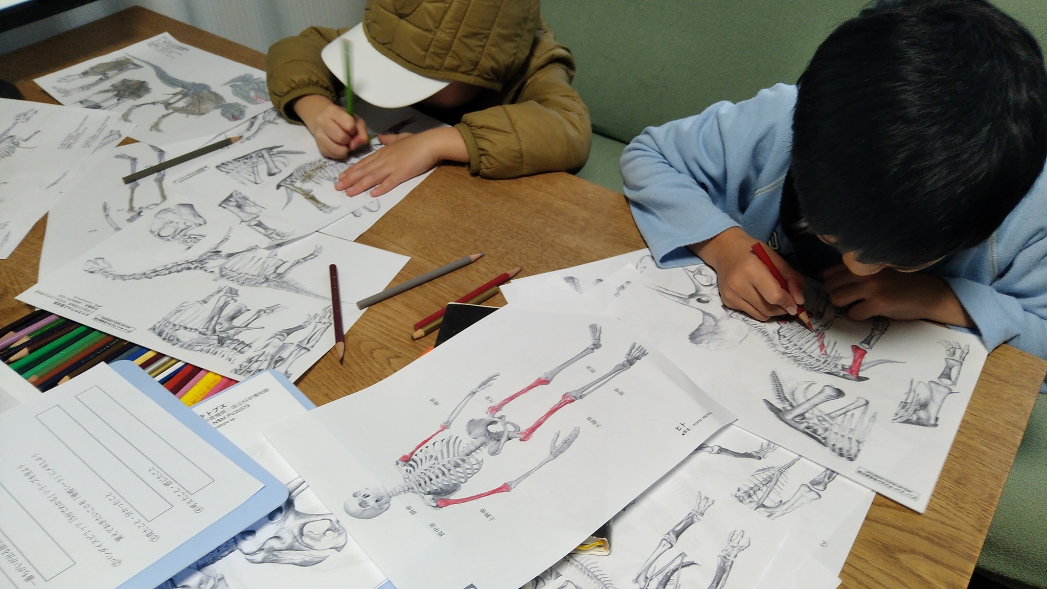 そこで、何種類かの恐竜の全身骨格をプリントし、同じ骨(例えば、太ももの骨)を同じ色で塗ってもらうことにしました。用意したのは、ティラノサウルス、アロサウルス、トリケラトプスなどです。そしてヒトも用意しました。