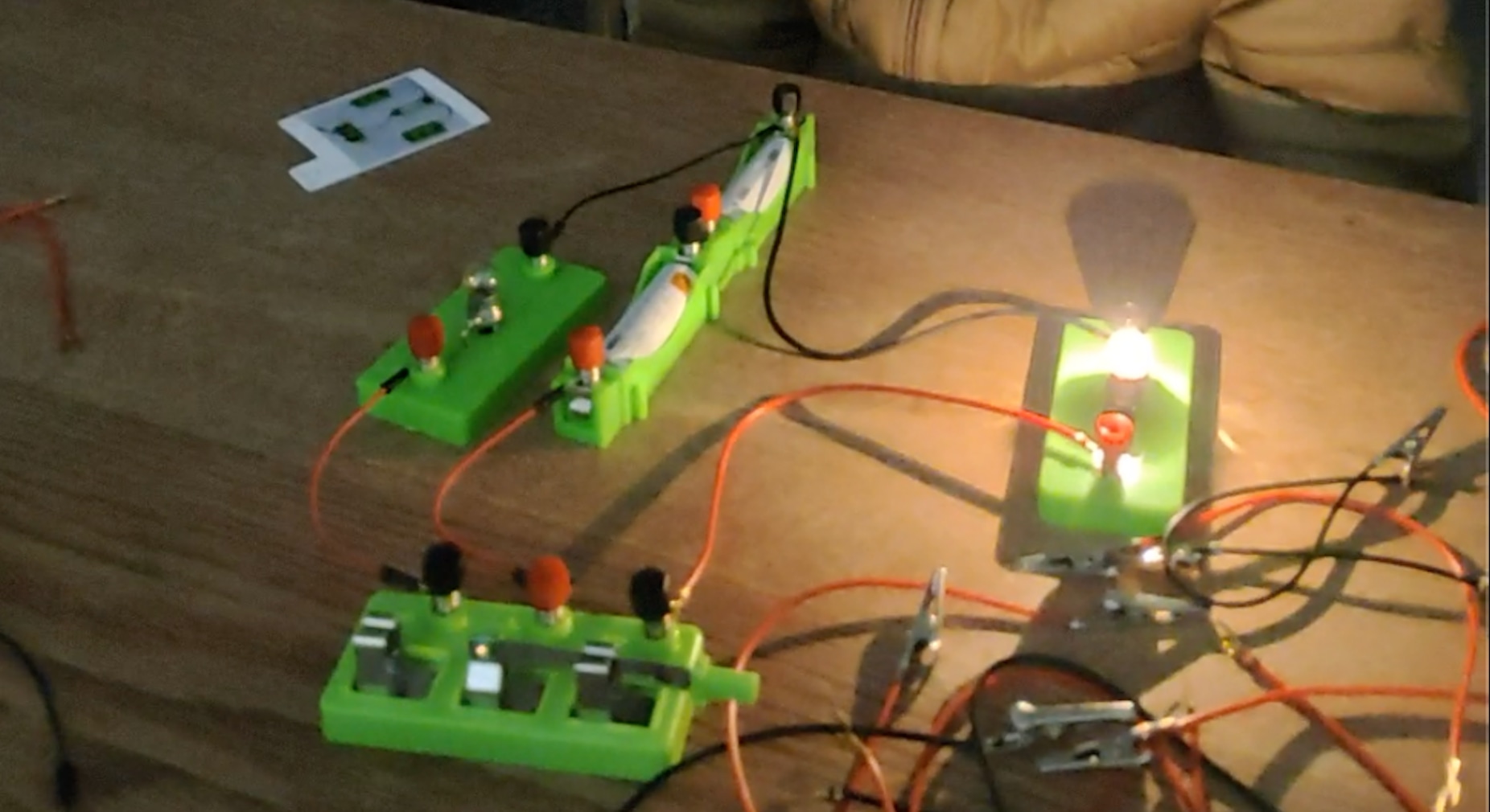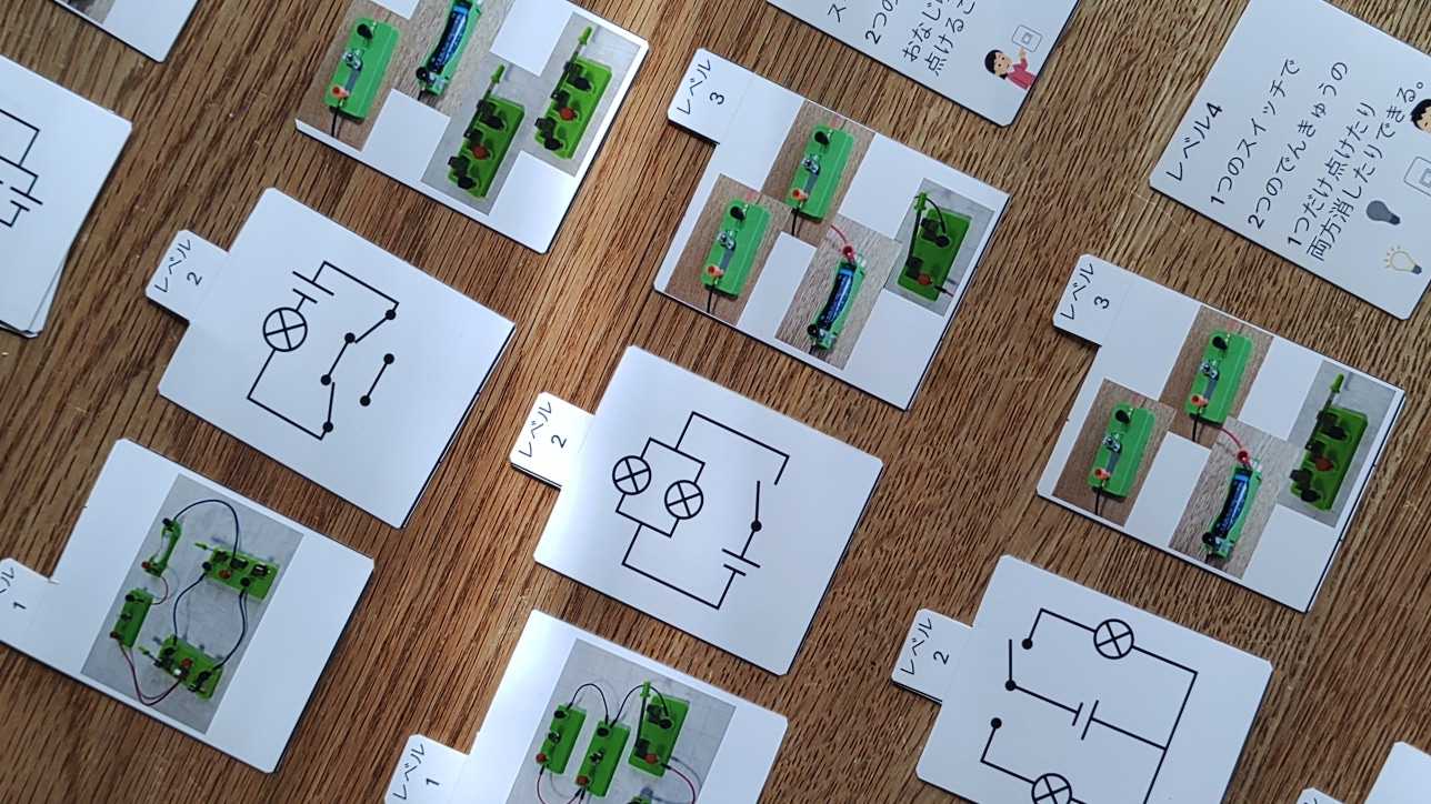 これまでも「この写真(あるいは絵)のように線をつないで、電球を点けよう!」という活動を行ってきました。もちろん、写真を見て回路を作るだけでも学びはあるのですが、写真を忠実に真似れば成功してしまうので、「ある目的のための回路を、自分で設計して作る」という力は育ちません。